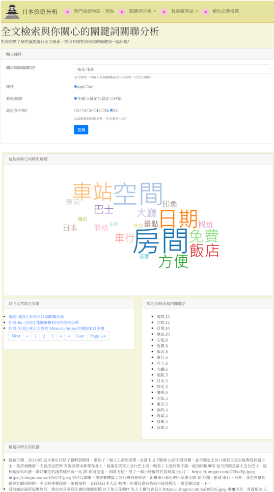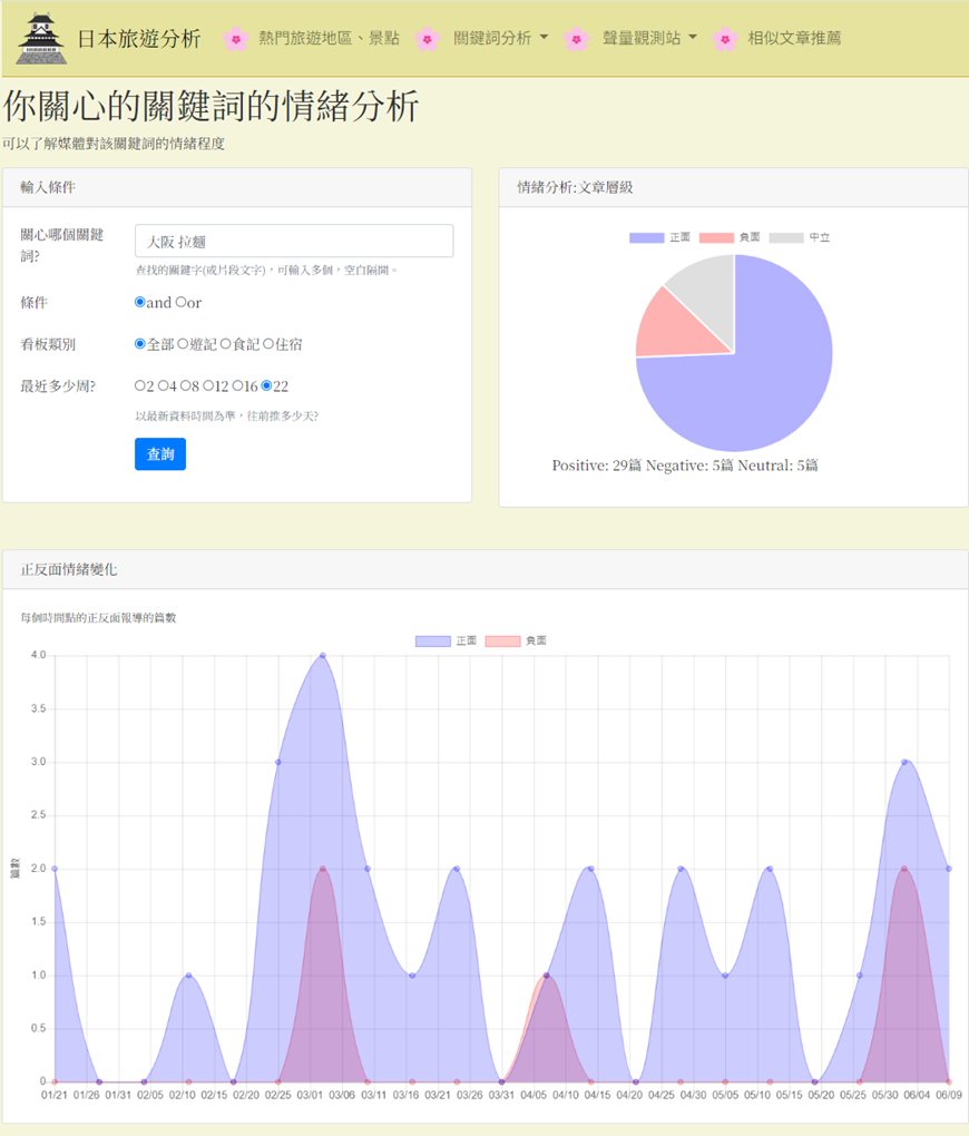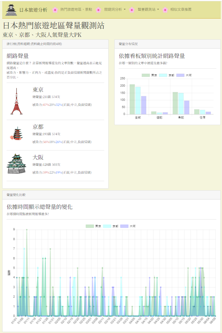 使用 Python (BeautifulSoup)自動爬取 PTT 日本旅遊版數據,結合 中研院中文斷詞 (CKIP Transformers)處理文本。透過 Pandas整理並統計旅遊資料,接著利用 BERT 模型 辨識網友的正負面情緒,並計算關鍵字之間的關聯性。最後以HTML、JS、Bootstrap 4,製作響應式數據儀表板,提供直觀的互動式圖表分析。