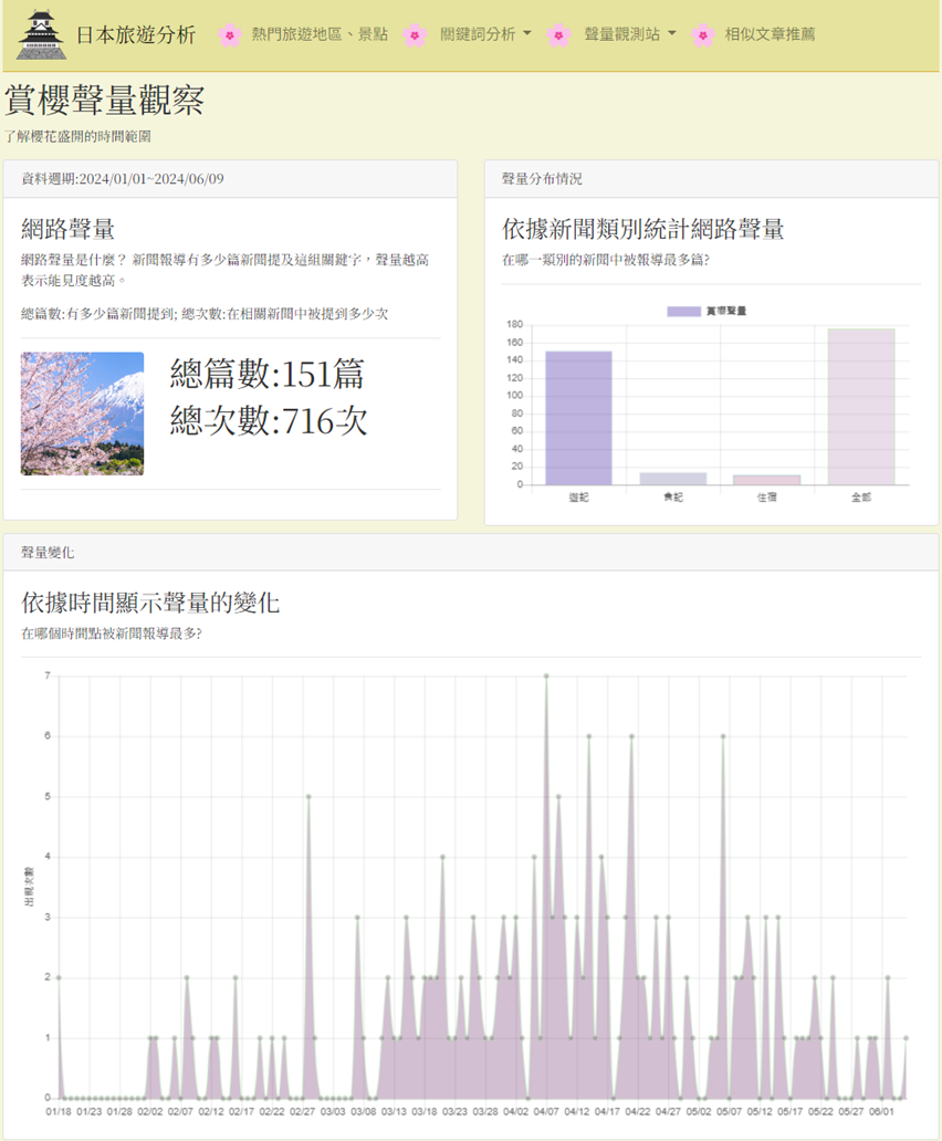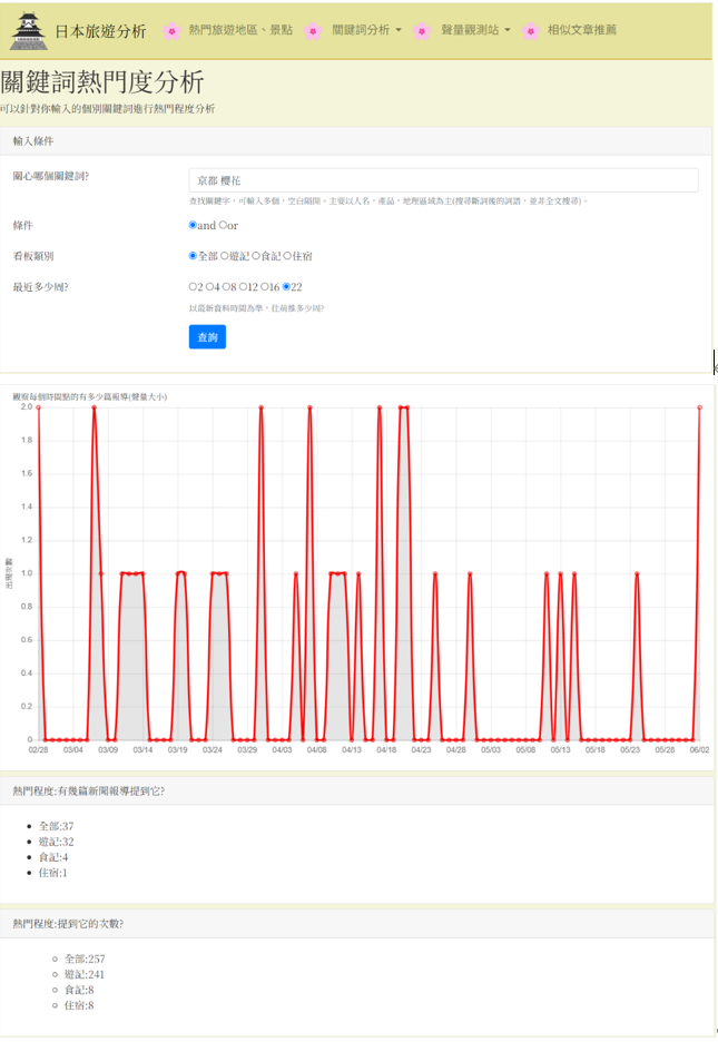 以「京都 櫻花」為例,分析 22 週的歷史數據。透過聲量數據趨勢圖,觀測到賞櫻高峰期出現在4月7日,可作為旅遊行程規劃的重要參考。