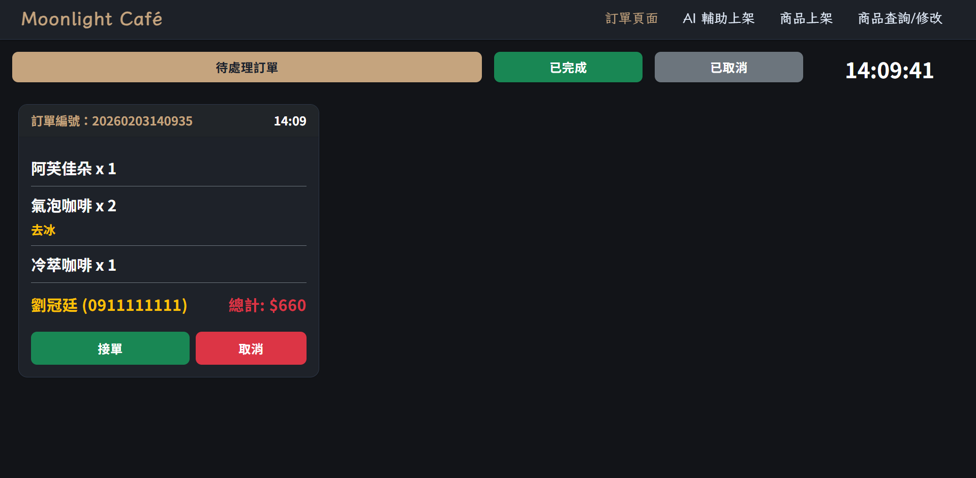 總共有待處理訂單、已完成、已取消三種不同的訂單狀態,當有新訂單時,待處理訂單頁面會自動出現新訂單,每筆訂單下方都會有兩個狀態按鈕,按下接單按鈕時,顧客端就會更新訂單狀態至餐點製作中,按下完成訂單按鈕時,顧客端系統會顯示請前往取餐,該筆訂單也會從待處理頁面移到已完成頁面。