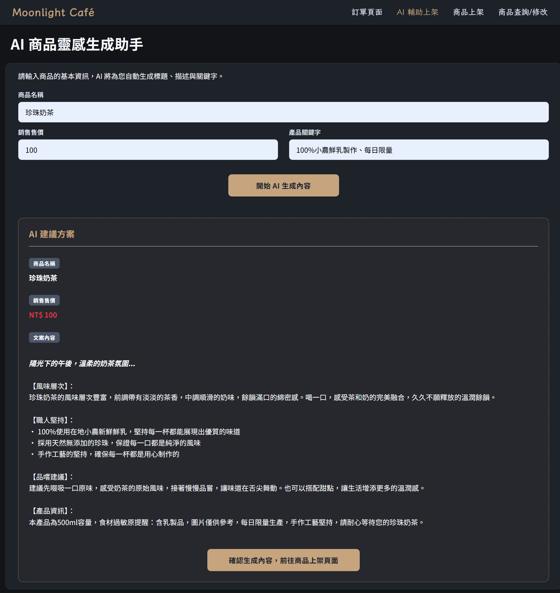 使用Groq AI功能,輸入商品名稱、售價與關鍵字,按下"開始AI生成內容"按鈕後開始進行AI文案生成,如大致滿意生成內容,按下"確認生成內容"按鈕後將AI文案自動帶入至商品上架頁面。