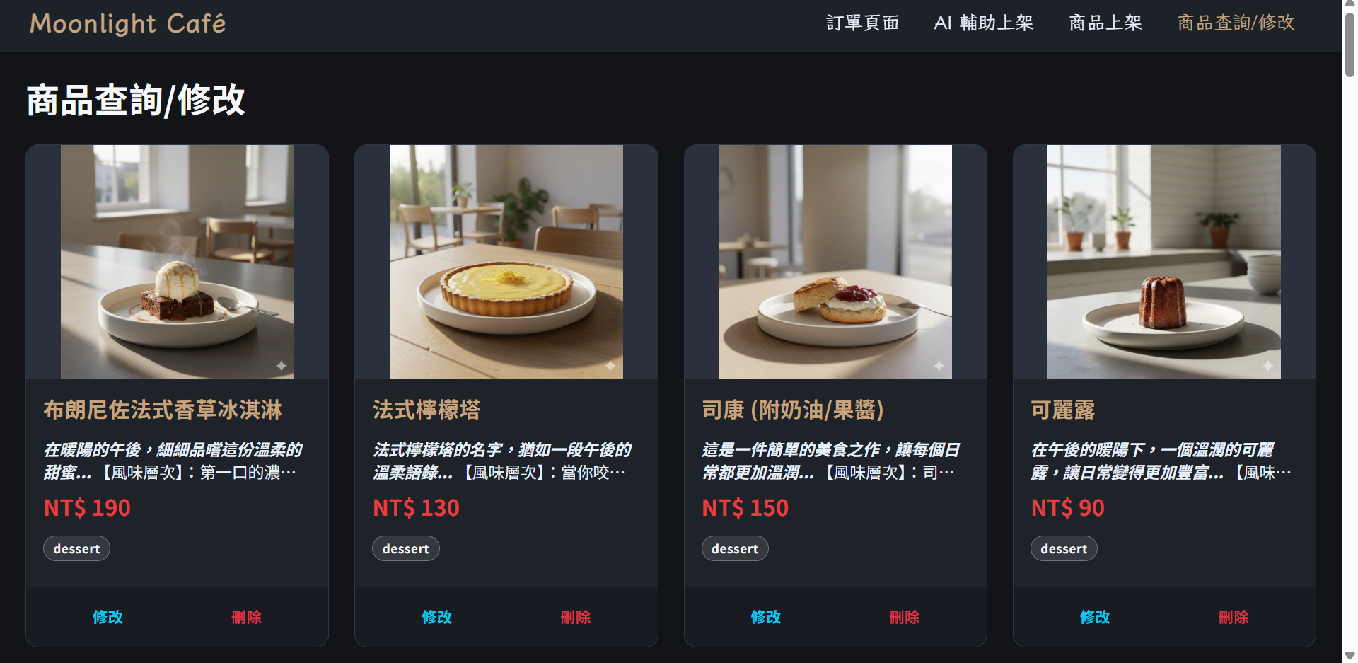 採用卡片式佈局,展示商品圖片、名稱、價格、分類標籤與上架狀態。按下每個產品下方的修改按鈕,即可將產品資訊帶入修改模式進行修改,按下刪除按鈕即可將該產品進行下架。