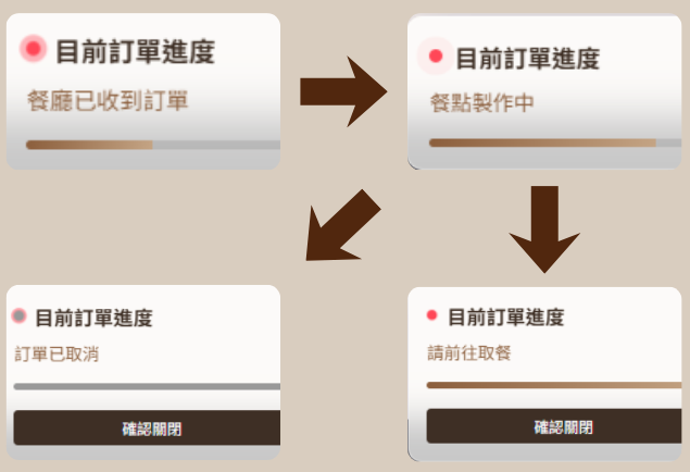 透過即時狀態回饋機制,清楚呈現餐點製作進度,協助使用者有效掌握取餐時機,提升整體流程效率與使用體驗。
